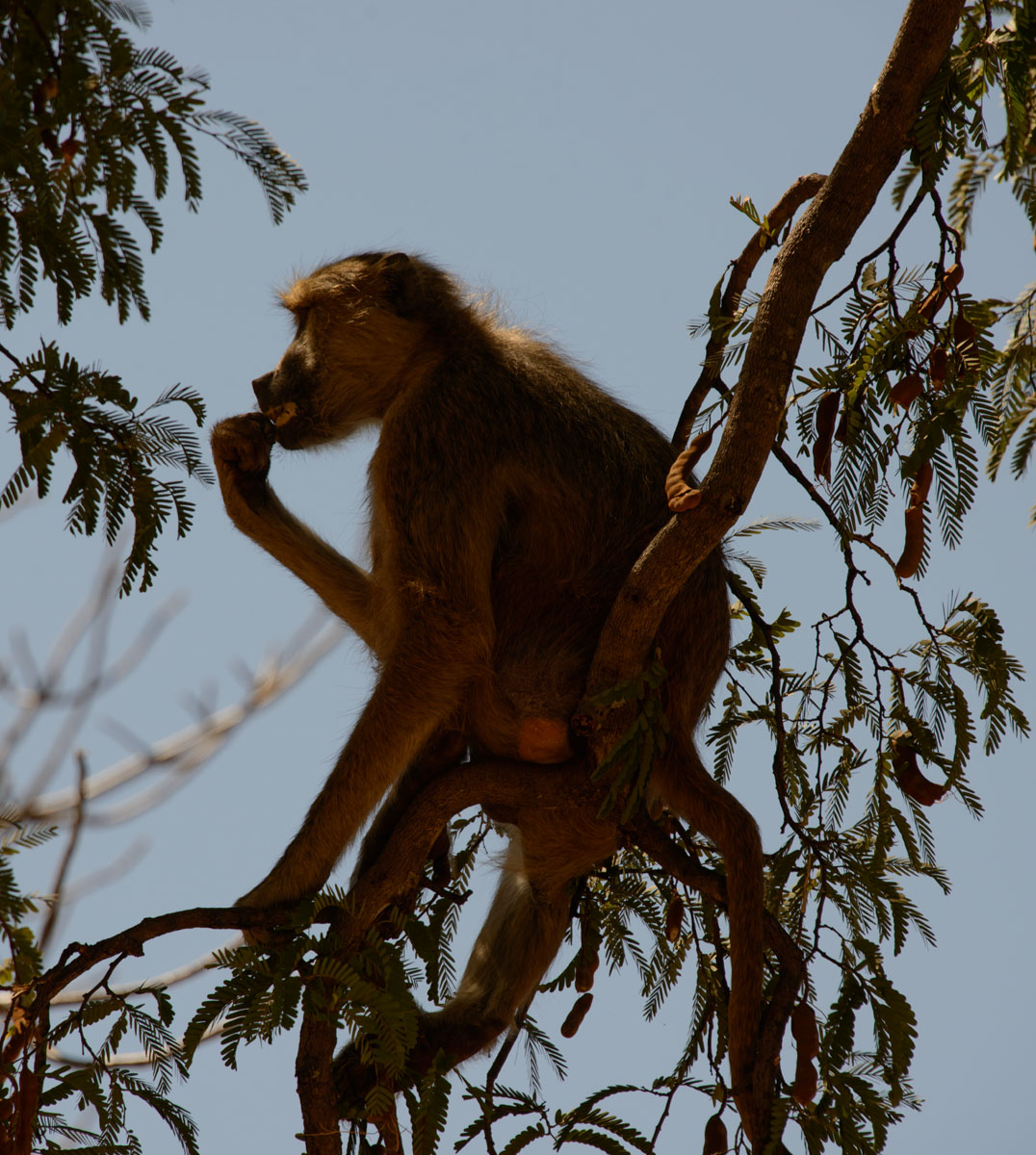Yellow baboon feeding on pods.