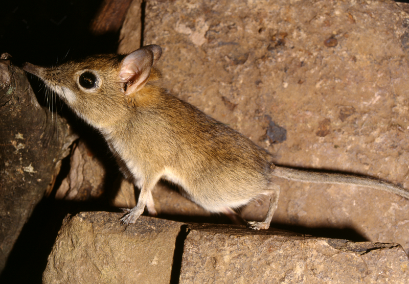 We pulled to the side of the road and observed an adult and subadult Bushveld Sengi (Elephantulus intufi) dashing from the shade of low scrub to snatch up allates and run back to cover to eat them, on numerous occasions.