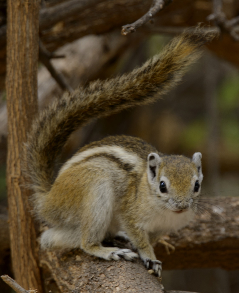 This small squirrel has one of the highest habitat tolerances of any African tree squirrel, from lowland forest to semi-arid, wooded, rock outcrops. In Namibia they are restricted to the far north-west, including western Etosha National Park, but the best locality to see it is at the Palmwag Lodge in Damaraland. Relax with a beer at the pub and one, or more, will oblige with a visit.