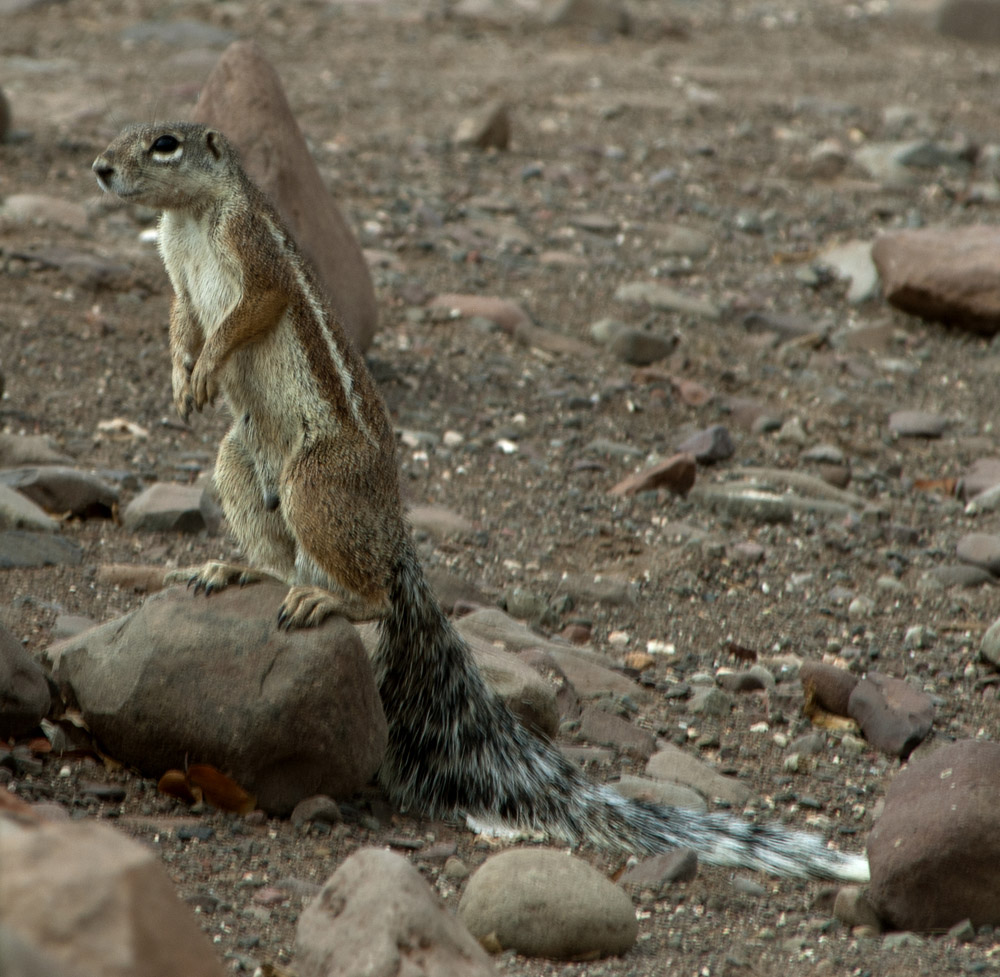 Unlike the Southern African Ground Squirrel (Xerus inauris), the Damara Ground Squirrel is usually solitary and not colonial and occupies rocky not sandy terrain. They tend to be more difficult to approach and not easy subjects for the cameras. In fact several images purporting to be this species on the internet are in fact ofSouthern African Ground Squirrels. Palmwag Lodge in Damaraland has several resident Damara Ground Squirrels but it requires patience as they are rather timid and rarely stay in on place for long.