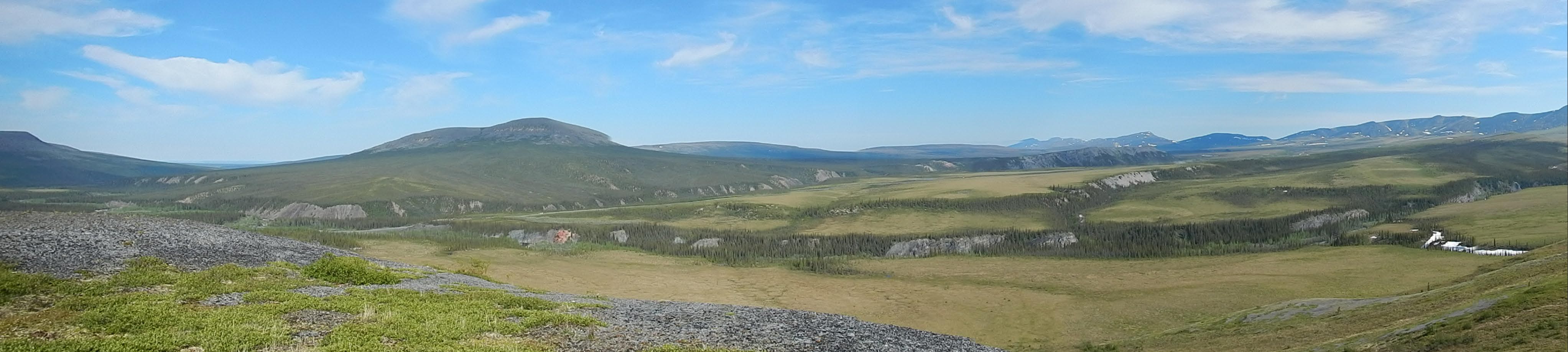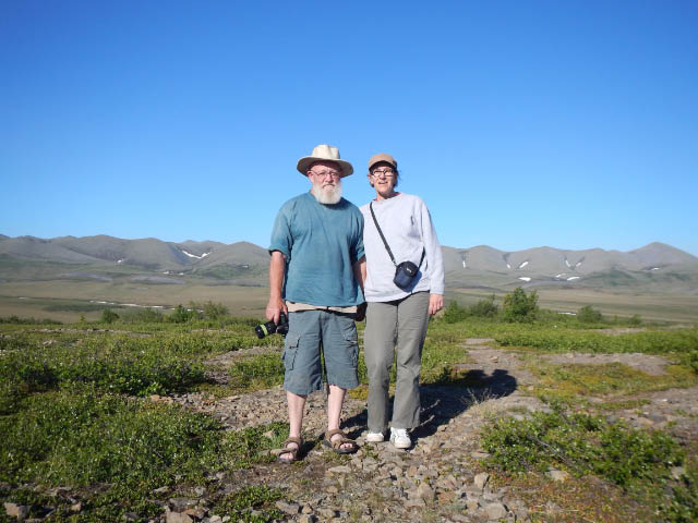 The Dempster Highway is a very well maintained gravel road, on a gravel bed very high above the surrounding muskeg, or tundra, or tussock grass plain. We stopped in a Yukon territorial campground just north of the Arctic Circle for 2 nights, and did a good walk onto a nearby hill, up there a breeze blew all the mosquitoes away! Look at this view: