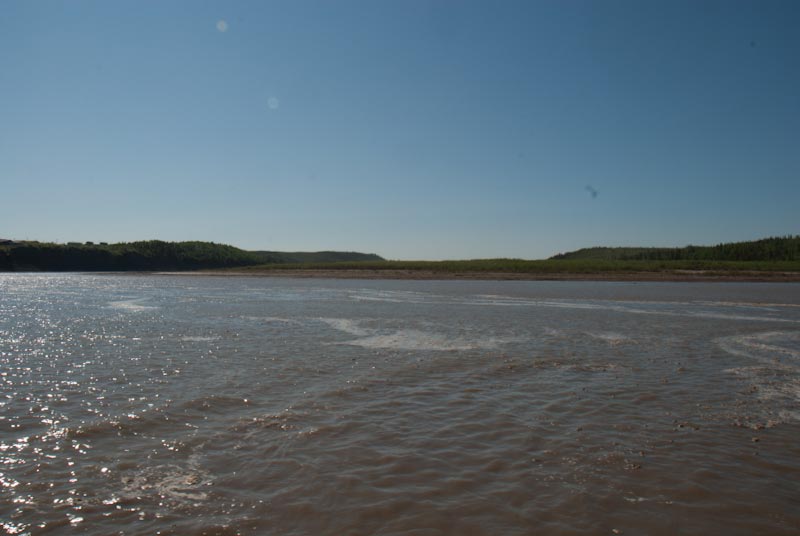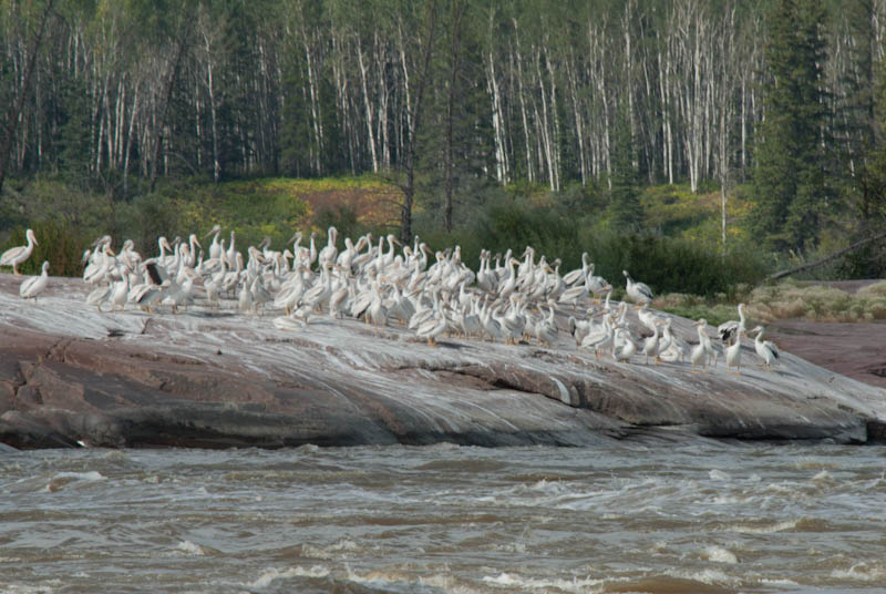 Tomorrow we will hire a car for a day visit to the Wood Buffalo National Park, we have seen one group along the road on our way here, they were quite restless. The rutting season is on, we hope to see some displays tomorrow. There is a lot of smoke in the air, plenty of patches of forest fires all around, warm and summery temperatures, we already experienced several thunderstorms. We will now have a look at the 'Rapids of the Drowned' on the Slave River, one of four rapids in this stretch. Pelicans are supposed to feed there. Fort Smith was established as a portage staging point along the river, and now people come from all over the world for white water rafting! Alexander Mackenzie named the rapids as above!