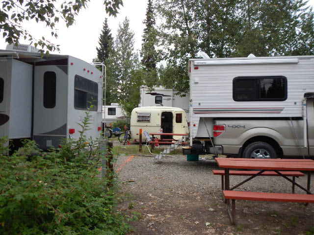 Chicken lives off his gold mining history and still is a mining centre, little camps scattered all around with tough looking, tatooed guys (and gals) coming to the only store for ice cubes. The RV park is 50% occupied by camper vans of miners, and a few tourists, not too bad yet. The weather stays summery, although cloudy today and a few odd drops, pleasant to sit out, mosquitoes only half bad.