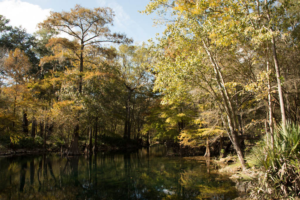Yesterday made our way into Florida, cruised through two of the State Parks, one along the Suwannee River the other featuring one of the famous fresh water springs. A large network of springs and caves is the delight of scuba divers here in northern Florida. We wondered why the wooden benches in this park were so high and upright - to rest your bottles and gear ready to be strapped on.