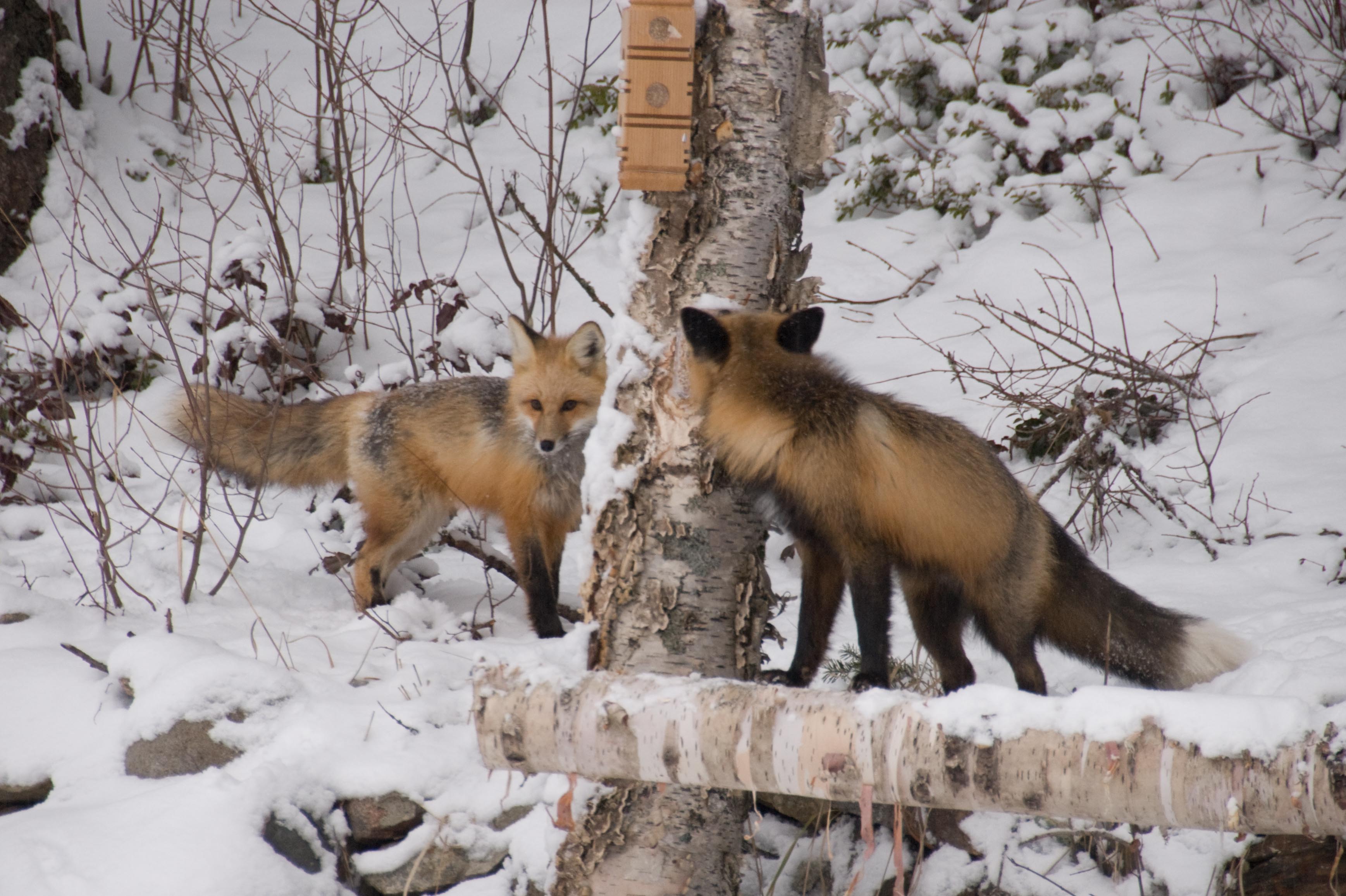 Red foxes (Vulpes vulpes) occur throughout much of North America and are frequently associated with towns and rural settlements. One morning in late February 2012 this pair, a 'pale' phase and a 'cross' phase, scouted our backyard at the edge of the Douglas-fir / Birch forest. They showed great interest in the woodpecker feeders and ate much of the fat. They spent 30 minutes exploring the garden, digging for voles in the 50 cm deep snow. The Red Fox has a very wide distributional range from close to the Arctic Circle to the deserts of Arabia.