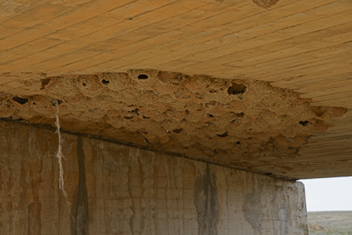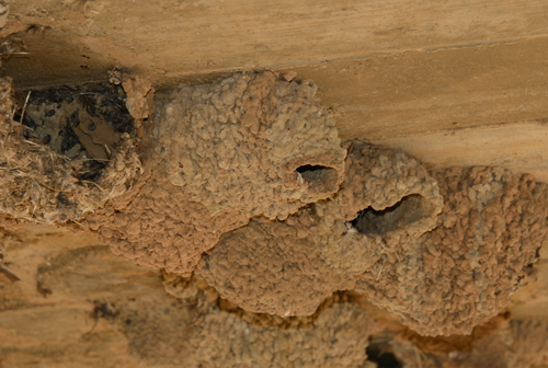 Once egg laying has started and the first chicks hatch several pairs of White-rumped Swifts harass and chase the swallows out of their nests, eject the eggs and even chicks if they are present. Nests taken over by the swifts are easily identified by feathers around the short entrances. Although both Cape and House sparrows will take over swallow nests we have never observed it at this location. For the latter it is too far from human habitation and although the former are around we have never seen them at this nest site.